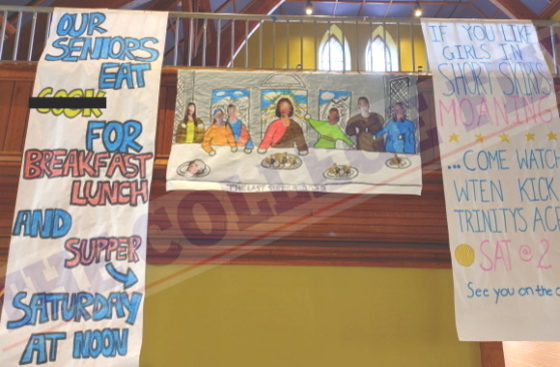 On Tuesday, student athletes also hung a banner (pictured) in the dining hall advertising an upcoming tennis match that used for inspiration the Last Supper mural by Leonardo da Vinci.
