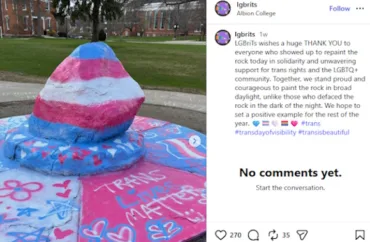 The painting covered up previous messages placed on the rock March 31 for “Trans Day of Visibility.”