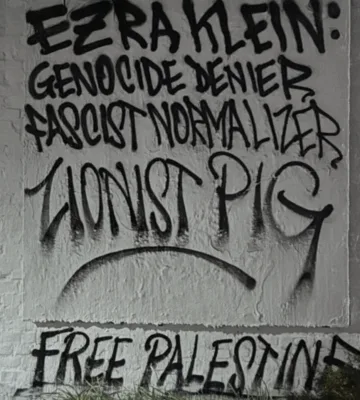 Without acknowledging Klein, the protester accuses him of “backing ‘genocidal ideology’” and yells “Ezra Klein, you’re a liar, you set Palestine on fire.”