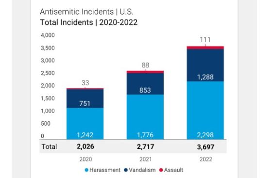 “In 2022, ADL tabulated 3,697 antisemitic incidents throughout the United States,” according to the report’s executive summary. “This is a 36% increase from the 2,717 incidents tabulated in 2021 and the highest number on record since ADL began tracking antisemitic incidents in 1979.”