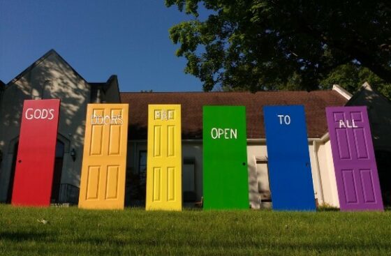 IMAGE CAPTION AND CREDIT: On the lawn of a church, doors are painted with the LGBTQ pride rainbow and the words,`God`s Doors Are Open To All’; Erin Alexis Randolph/Shutterstock