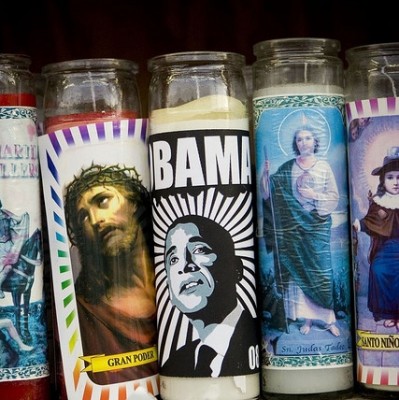 An image of Obama with his arms outstretched and a crown of thorns on his head? Artistic expression.
