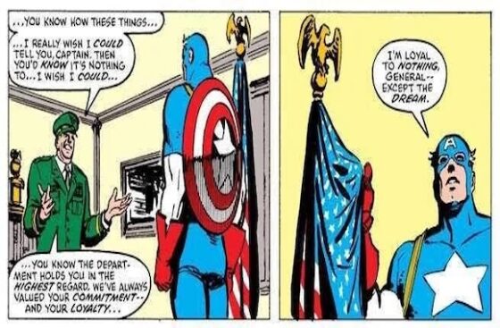 It springs to mind the classic mid-80s comics panel by Frank Miller and David Mazzucchelli (pictured) of Captain America holding Old Glory and correcting a corrupt general who swarmily invoked “loyalty.”
