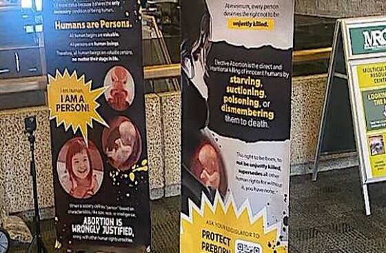 The SFLA display included images of fetuses and small children along with the phrases “I am a person” and “abortion kills human persons.” Posters also included the words “suctioning” and “poisoning” in their descriptions of the procedure.