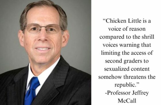 “Chicken Little is a voice of reason compared to the shrill voices warning that limiting the access of second graders to sexualized content somehow threatens the republic,” DePauw University Professor Jeffrey McCall wrote recently.