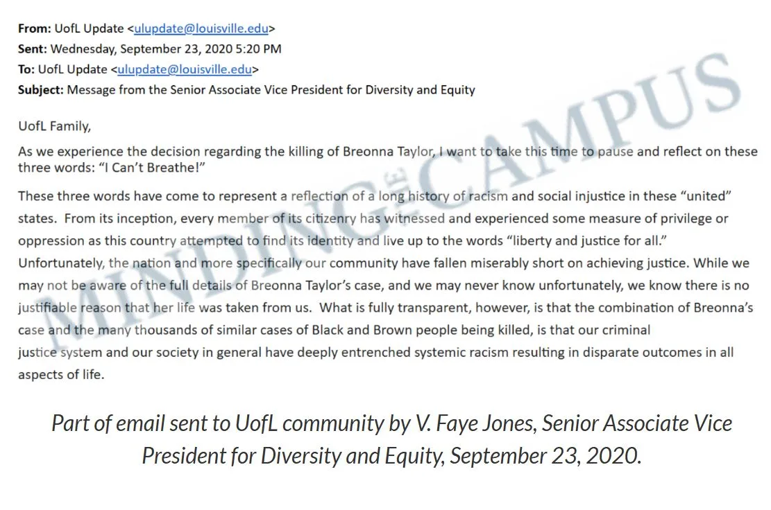 For example, UofL hosted an open session immediately after the 2016 election to help people process the so-called trauma of Donald Trump’s victory, which was attended by hundreds of students, faculty, and staff. It did the same in response to the death of George Floyd. And, following the grand jury decision not to indict any Louisville police officers in the death of Breonna Taylor, UofL Senior Associate Vice President for Diversity and Equity, V. Faye Jones, sent an email to the entire campus community, asking everyone to reflect on the words, “I Can’t Breathe!” She also used the occasion to perpetuate the notion that the criminal justice system targets racial minorities, a claim that stokes division rather than truth and stands at odds with the data.