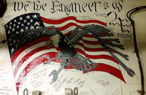 “Each summer our students sail on our training ship the Training Ship Golden Bear to destinations around the world, and it has been a rich maritime tradition to paint a mural on the walls of the ship commemorating the adventure,” Karl Rodvik, a current senior, told The College Fix. “Then students in their respective division sign their mural.”