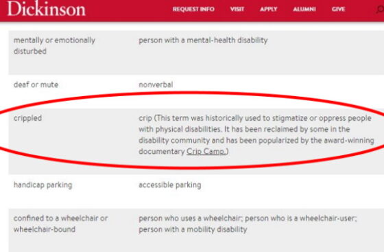 While “crippled” is “discouraged,” the term “crip” is acceptable, according to the university, because while it “was historically used to stigmatize or oppress people with physical disabilities … [crip] has been reclaimed by some in the disability community and has been popularized by the award-winning documentary Crip Camp.”