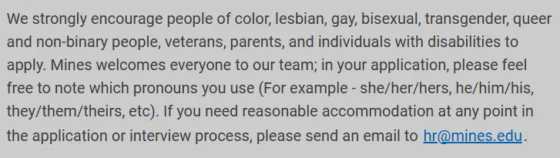 “We strongly encourage people of color, lesbian, gay, bisexual, transgender, queer and non-binary people, veterans, parents, and individuals with disabilities to apply,” the school states on its job opening. “Mines welcomes everyone to our team; in your application, please feel free to note which pronouns you use (For example – she/her/hers, he/him/his, they/them/theirs, etc).”