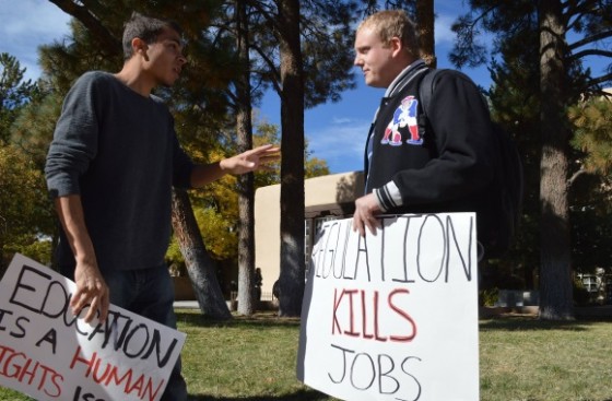 The incident took place on campus during the Million Student March Nov. 12, when members of the conservative Young Americans for Freedom and libertarian Young Americans for Liberty flanked the march with signs offering slogans such as “Nothing is Free.”