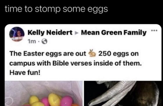 Conservative students at the University of North Texas have been attacked for their Bible verse Easter egg hunt, with many in the campus community calling for a mass trashing and stomping of the eggs.
