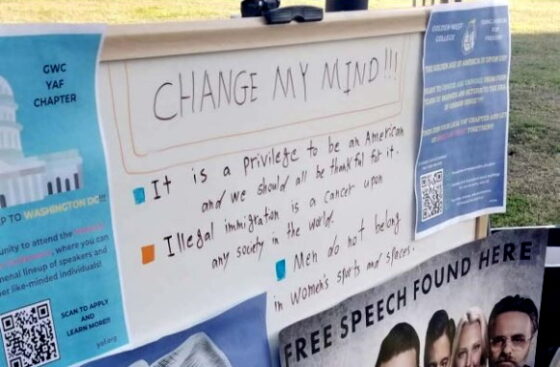 Their YAF booth displayed a whiteboard that read: “CHANGE MY MIND!!! • It is a privilege to be an American and we should all be thankful for it. • Illegal immigration is a cancer upon any society in the world. • Men do not belong in women’s sports and spaces.”