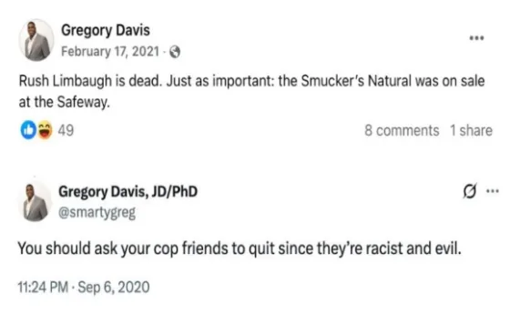 Davis suggested Trump was the “worst of Nixon and Hitler” in a 2016 post. In 2021, Davis posted: “Rush Limbaugh is dead. Just as important: the Smucker’s Natural was on sale at the Safeway.”