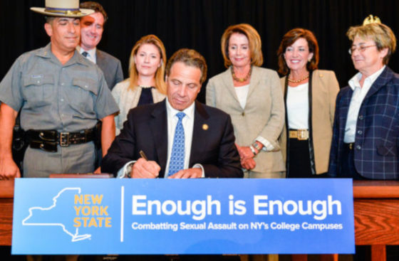 In July 2015, surrounded by a table full of female elected officials that included Democratic House Leader Nancy Pelosi, Cuomo signed a bill he claimed combatted sexual assault at New York colleges and universities.