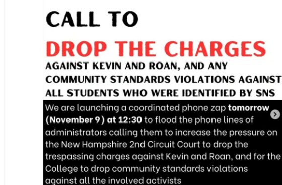 Sunrise Dartmouth posted on Instagram Nov. 9 a call to “Drop the Charges” against both students and announced a “coordinated phone zap…to flood the phone lines of administrators.”