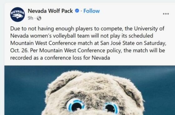 “Due to not having enough players to compete, the University of Nevada women’s volleyball team will not play its scheduled Mountain West Conference match,” the school announced on its website.