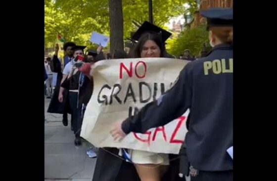 Videos posted on social media show the cap and gown-donning activists hoisting signs, waving the Palestinian flag, and chanting “disclose, divest, we will not stop, we will not rest” and “free, free Palestine.”