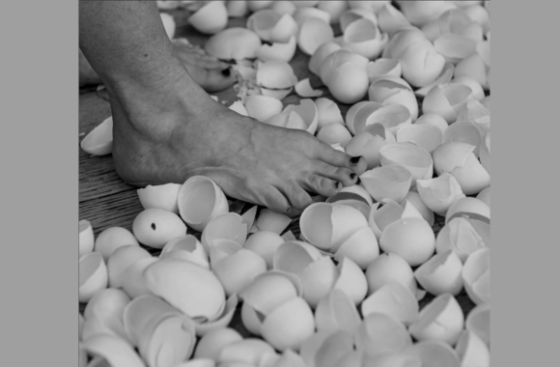 One way includes performance art involving stepping on porcelain eggshells while reciting a speech called “shattering whiteness” (portion below).