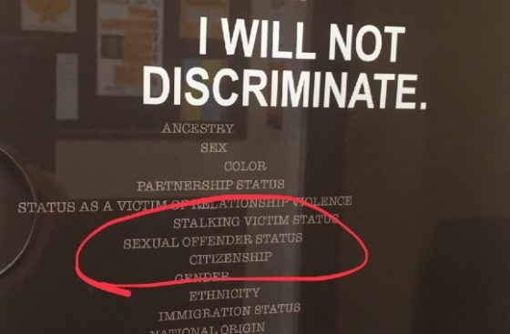 People should “not discriminate” against someone based on sex, race, disability or religion according to the poster, nor someone’s “sexual offender status.”