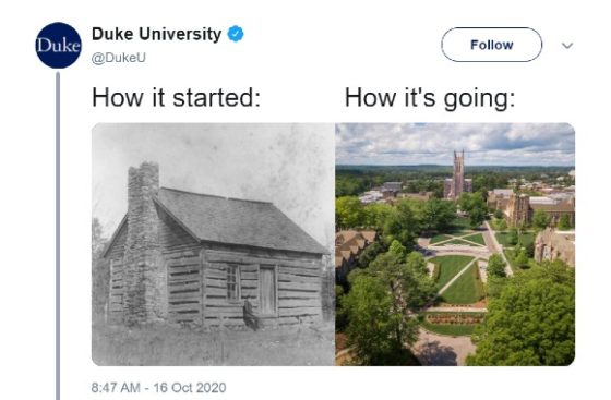 Duke University’s social media team wanted to take advantage of a Twitter trend commonly referred to as “how it started/how it’s going” where users post photos that depict weight loss, stages in their relationship or other success stories. The original tweet is seen in the featured image.