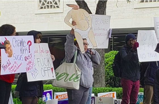Before the event began, seven students showed up with signs mocking Kirk personally and TPUSA generally, copying images and rhetoric from social media. One called Kirk a “racist man baby” and another read “No Kirk, No KKK, No TPUSA.”