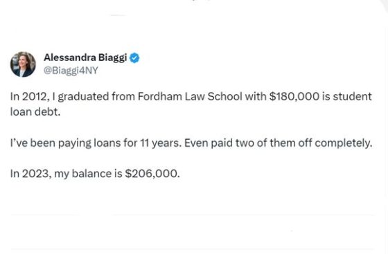 “In 2012, I graduated from Fordham Law School with $180,000 is student loan debt. I’ve been paying loans for 11 years,” New York Democrat Alessandra Biaggi tweeted, presumably in response to the Supreme Court striking down President Joe Biden’s bailout of borrowers. “Even paid two of them off completely. In 2023, my balance is $206,000.”