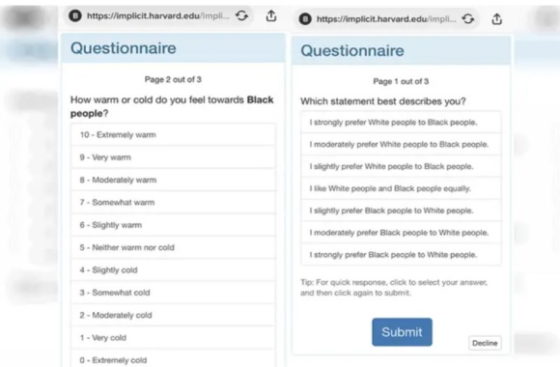 The test asks participants whether or not they feel “warm” or “cold” toward black people, or whether they prefer white people to black people, according to the screenshots.