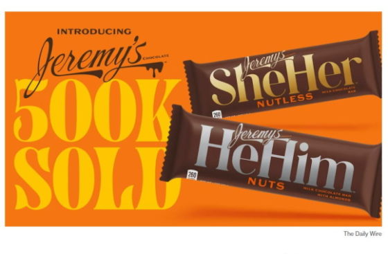 Jeremy’s Chocolate bars are labeled with the pronouns “He/Him” and “She/Her,” the former of which have nuts in them and the latter of which do not. Progressives on social media have criticized the brand as “transphobic.”