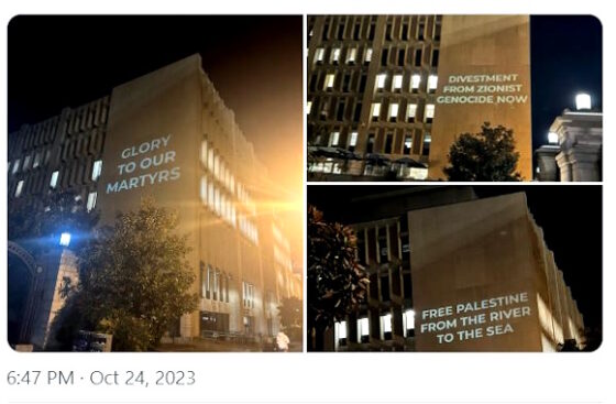 George Washington University – students are projecting horrifying messages onto a school library building glorifying Hamas terrorists that beheaded babies, raped teenage girls, and murdered 1400+ people.