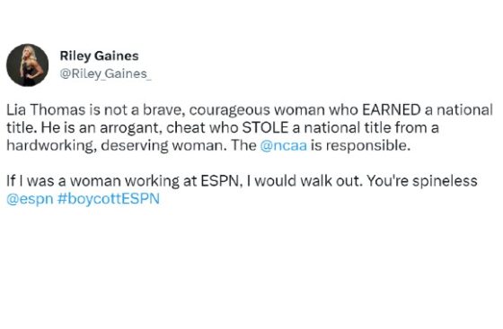 OutKick’s David Hookstead tweeted a clip of the ESPN segment along with is own comments. “ESPN celebrated Women’s History Month by promoting a special about transgender swimmer Lia Thomas……a biological male who destroyed real women in the pool,” Hookstead wrote.
