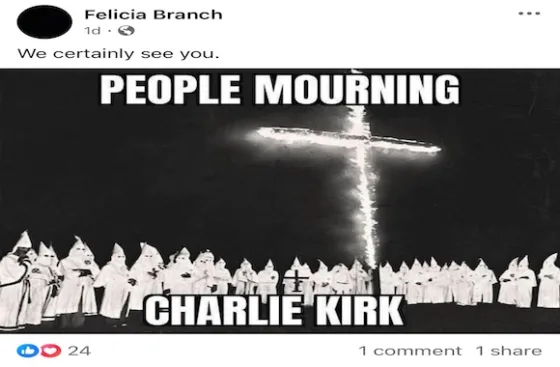 Branch also posted a meme showing members of the Ku Klux Klan surrounding a burning cross with the title “PEOPLE MOURNING CHARLIE KIRK.”