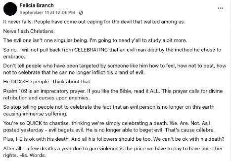 In a since-deleted Facebook post, Branch wrote “It never fails. People have come out caping for the devil that walked among us […] so no. I will not pull back from CELEBRATING that an evil man died by the method he chose to embrace.”