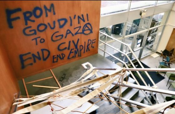 A video on X shows the hallway of one administrative building covered in trash and graffiti, including the words “Free Palestine” written in black near the door to the Office of Diversity, Equity, and Inclusion. The phrase “Stop the genocide” was scrolled on the Office of the President, according to the video.