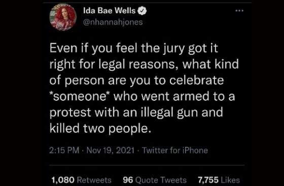 “He carried a gun he could not legally have illegally across state lines and killed two people,” Professor Hannah-Jones wrote in a since-deleted tweet.