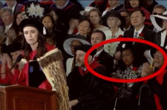 Jackson can be seen behind New Zealand Prime Minister Jacinda Ardern during the May 26 commencement ceremony at Harvard University. Ardern listed a number of liberal political victories the country had achieved, such as action on climate change and LGBT agenda items.