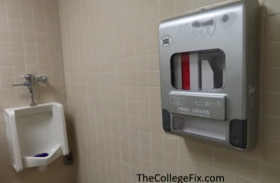 Photos received by The College Fix show a dispenser containing both tampons and pads located next to the urinals.