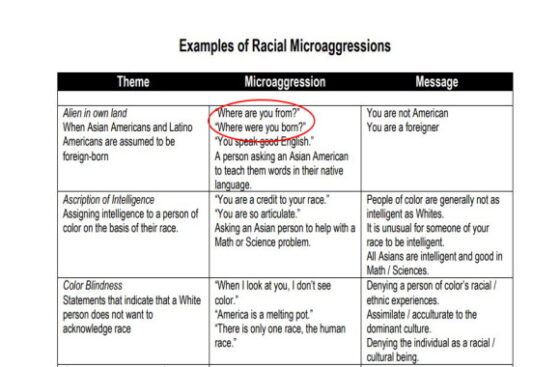 The course includes a section focused on microaggressions, and students are asked to review a list of “typical microaggressions.” On that list, questions such as “Where are you from?” and “Where were you born?” are listed as “racial microaggressions.”