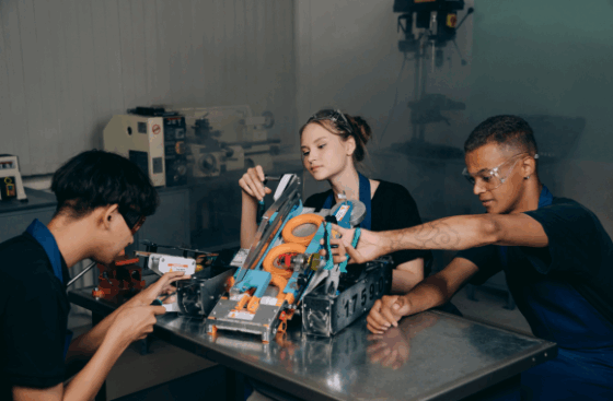 IMAGE CAPTION AND CREDIT: Several students work on a technology project; Mikhail Nilov/Pexels