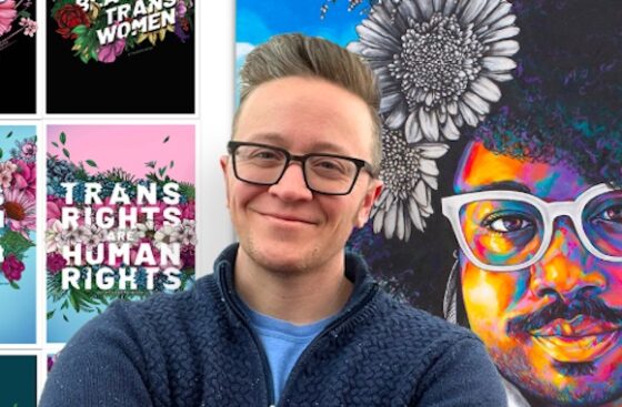 IMAGE CAPTION & CREDIT: Artist Rae Senarighi stands in front of several of pro-trans images; Rae Senarighi/Facebook. INTERIOR IMAGE: Rae Senarighi/Facebook