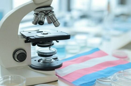 IMAGE CAPTION AND CREDIT: A transgender flag next to a microscope, symbolizing gender research; Grok