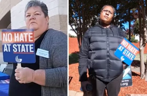 Mikyta Daugherty, associate director of clinical services, is holding a “No Hate at State” sign as she stands directly in front of the display, the video shows. She makes two appearances. (Created Equal activists routinely wear body cameras to document their interactions on campus.)