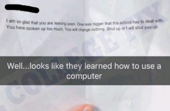 “I am so glad that you are leaving soon. One less [n-word] that this school has to deal with,” the anonymous note Wells found on her car stated. “You have spoken up too much. You will change nothing. Shut up or I will shut you up.”