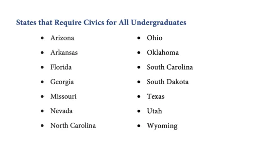 It also noted that while most states require a civics course for high school graduation, few require future teachers to study civics in college.