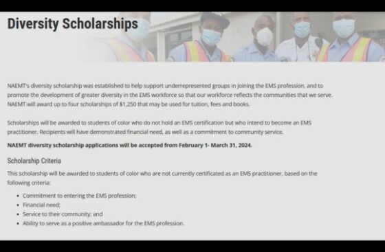 “NAEMT’s diversity scholarship was established to help support underrepresented groups in joining the EMS profession, and to promote the development of greater diversity in the EMS workforce so that our workforce reflects the communities that we serve,” the website originally stated. “NAEMT will award up to four scholarships of $1,250 that may be used for tuition, fees and books.”