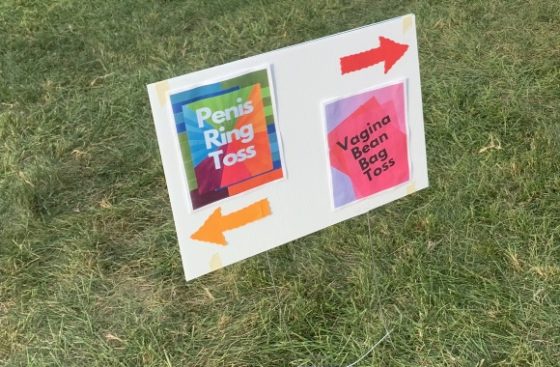 The vagina bean bag toss boasted giant inflatable lips that served to mimic a “vagina,” and students could throw large pink bean bags into it. The game doubled as an educational display, informing students on flyers that “not all people with vaginas are women.”