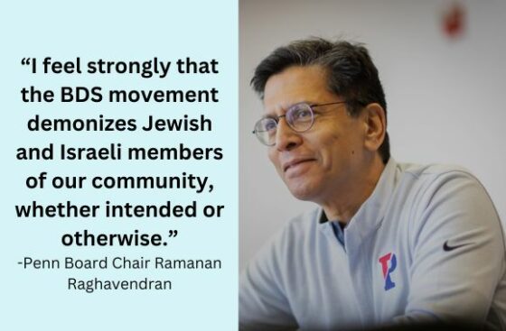 “Penn does not support divesting from, boycotting, or sanctioning Israel,” Board Chair Ramanan Raghavendran told the university’s internal news blog. He said he was sharing the view of President Larry Jameson.