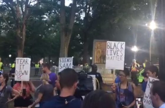 CHAPEL HILL, NC — Chants of “Cops and Klan go hand in hand,” “Who do you protect? Who do you serve?” and “No cops, no KKK, no fascist USA” echoed through UNC Chapel Hill’s McCorkle Place on Thursday night as a large and rowdy group of protesters converged to stand against talk of returning the recently toppled “Silent Sam” statue to its place on campus.