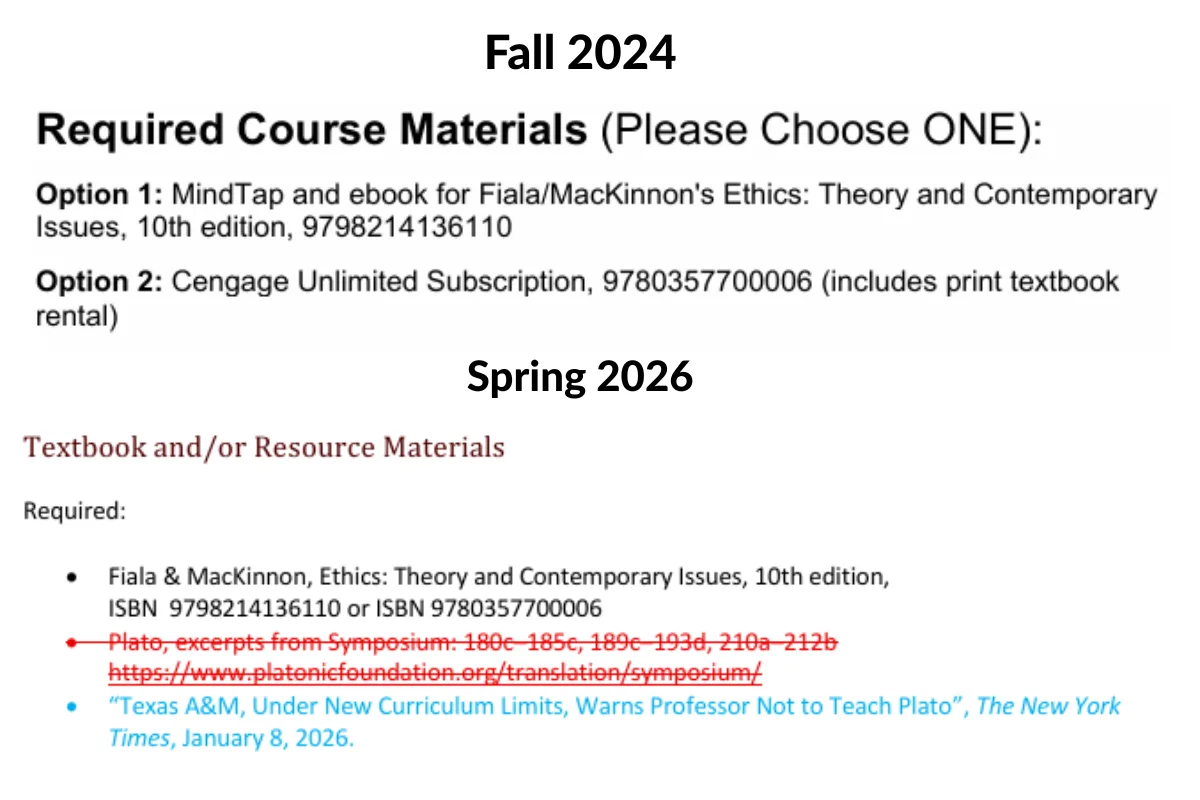 Indeed, TAMU officials have no broad objection to Plato – students in Philosophy 251 study it this semester, along with other authors including Rousseau, Hobbes, and Hannah Arendt. Likewise, students in Political Science 203 must read Plato and Aristotle.