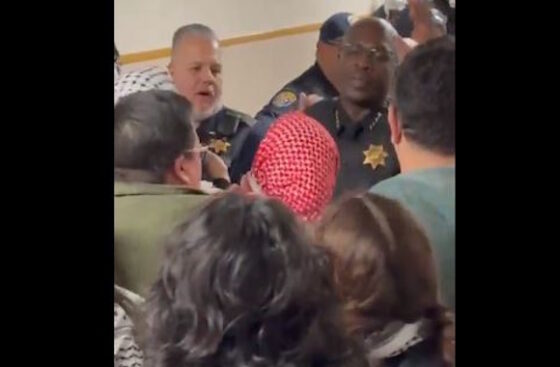 A guest lecture by a Jewish professor on Monday at San Jose State University turned physical when police were forced to contain a rowdy crowd of protesters and protect the scholar as he exited the building, pictures and video posted on social media show.