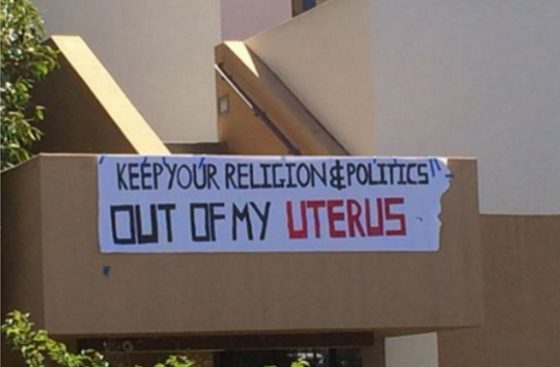 A banner anonymously hung on the campus recently saying “Keep your religion and politics out of my uterus” might offer some explanation (pictured).